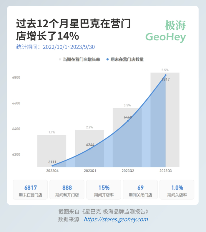 根据极海品牌监测的数据显示,过去一年星巴克新开门店近900家,截至今年9月底,在营门店数量达到6817家,同比增长14%。