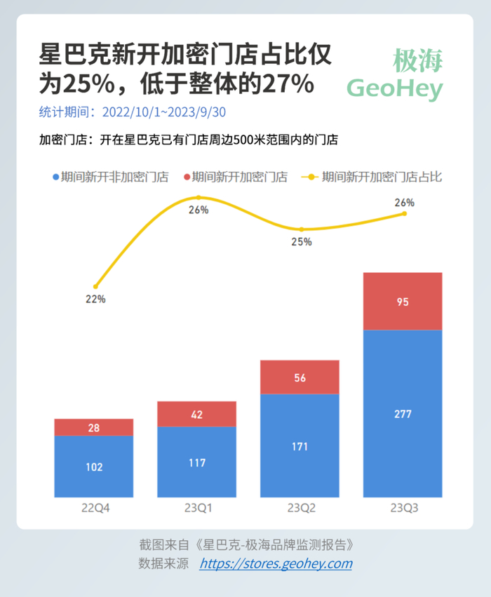 事实也正是如此,星巴克的整体门店密度为27%,这意味着截至今年9月底,在营门店中有27%的门店开在已有门店周边500米范围内。但在过去一年里星巴克的新开的800多家门店中,加密门店的占比仅为25%。