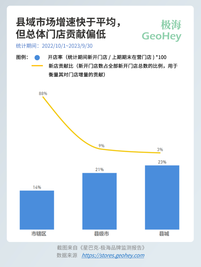 而从下面这张图我们可以看到,从增速上看,星巴克过去一年在县域市场上的确有所倾斜,县级市和县城的开店率均超过了20%,高于市辖区的14%。