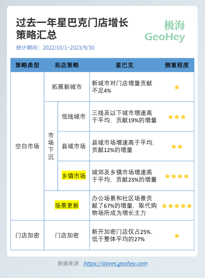 下面让我们来总结一下星巴克在过去一年的增长策略,主要的增长点集中在场景更新和乡镇市场两个方向。