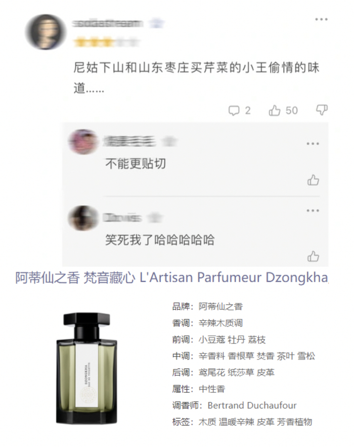 漂亮的名字、精致的文案,情绪价值是满的,参考价值是有待商榷的,还不如民间自创超场景化文案来得直观,或许还有意想不到的种草效果——就有网友因为看到某支香水被吐槽是“发票味”而动了买的心思。