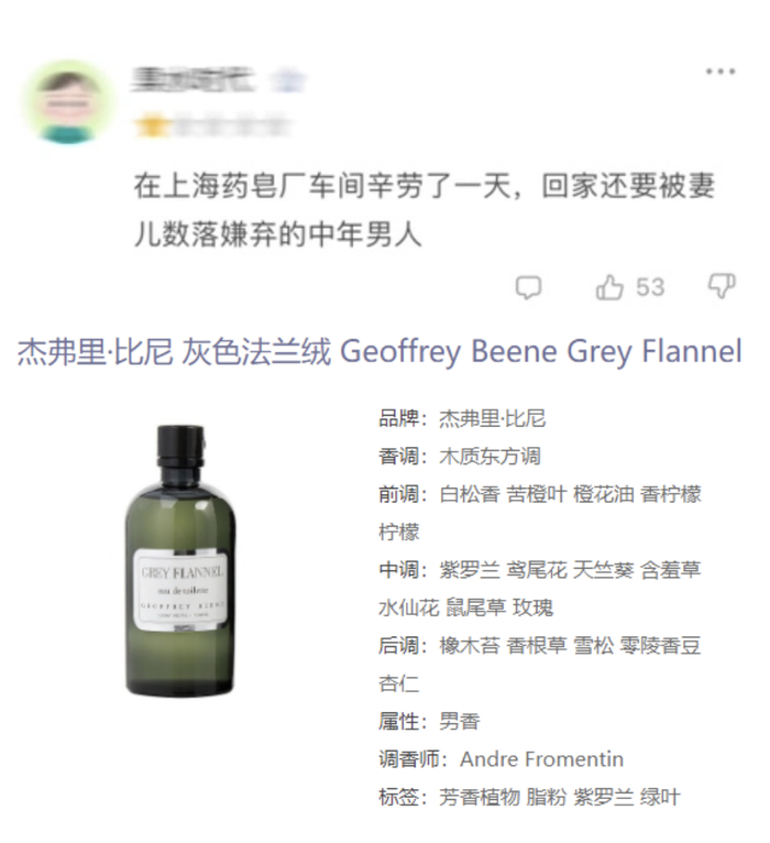段位更高的香评,直接把“买家秀”也给揭穿了,越过描述香味的阶段,直接“闻香识人”,用香水给人分了类:“喷香水的男的可以大致分为三类,旷野哥、蔚蓝哥、大地哥。”