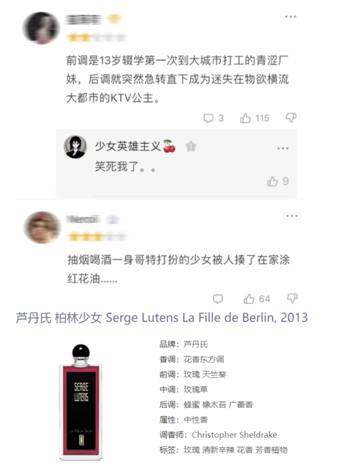 芦丹氏(Serge Lutens)的“柏林少女”,主打花香调,结果少女还是少女,柏林却不太柏林,被网友写成发人深省的现实主义题材,契诃夫看了沉默,莫泊桑看了流泪,贾樟柯看了连夜编剧: