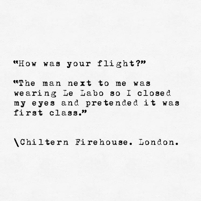 “坐在我旁边的男的喷了 Le Labo,所以闭上眼睛的时候,我就会幻想我正坐在头等舱里。”