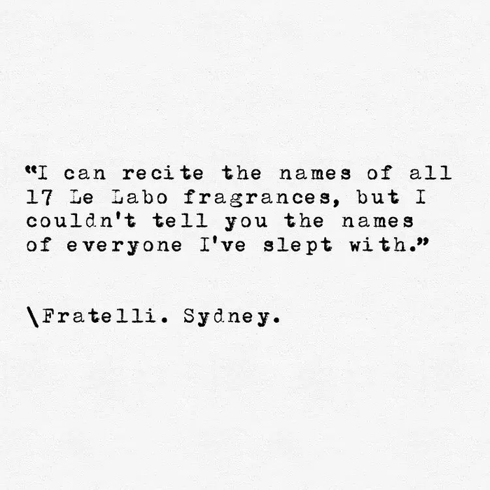 又比如:“我能背出17种 Le Labo 香型,但是我没法儿说出每一个跟我睡过的人的名字。”