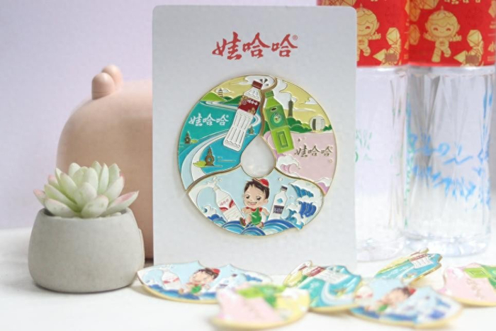 现场,娃哈哈亚运定制徽章深受大家喜爱,徽章整体采用烤漆工艺制作,由三枚徽章品组成完整一套。整组徽章外观为圆形,寓意圆满,三枚小徽章分别选取了代表杭州特色的自然和人文景观,结合相对应的娃哈哈代表性产品纯净水、龙井绿茶、苏打水。