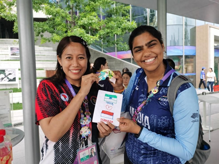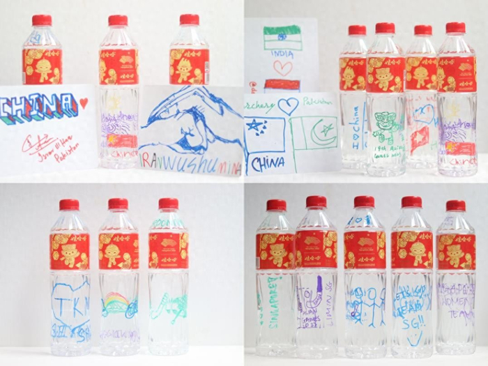 除交换徽章外,娃哈哈当日的品牌活动还鼓励大家在卡片、晶钻水瓶上留下了对中国的喜爱,借晶钻水联结国际情,不少运动员通过这样生动有趣的活动结交了跨国友谊。活动上,来自印度尼西亚的Anita和来自印度的Saloni两位一拍即合,选择共同完成一幅作品,最后她们拿起娃哈哈徽章与联合画作一起合照,收获了一段意外的跨国友谊。