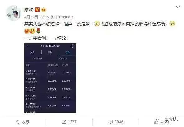 2018年4月,《温暖的弦》收视率开门红,上线9天,网播量累计21.1亿,陈欧还就此发了微博。