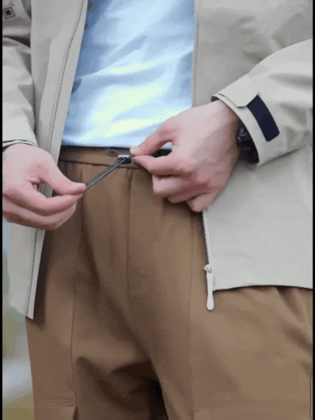 用梭织纤维与柔软弹力针织底复合而成,让面料兼具柔性和刚性,防风、防水的同时还有一定的弹性,才实现了上身好看又舒适。