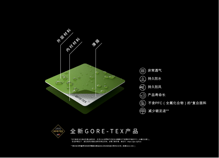 获得了兼具轻薄和强韧的创新型薄膜,再与GORE-TEX专供的纺织面料相贴合后,创造出极轻、极薄的复合材料,并应用于终端鞋服产品之中。所有产品都会通过GORE-TEX品牌实验室中的防水防风透气测试、耐磨耐撕裂测试、和舒适性测试、实地测试等,再投入到消费市场。