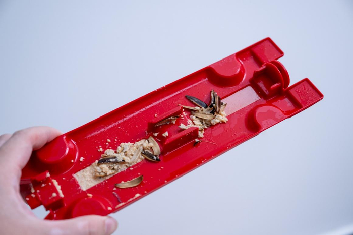 从上方对瓜子壳、饼干碎等固体碎屑的实际清洁中,我们就能看到,从机器接触到固体垃圾到最终清洁完成,过程中并无垃圾被遗漏在地面上,机器的清洁效率也没有因为垃圾的堆积而下降。