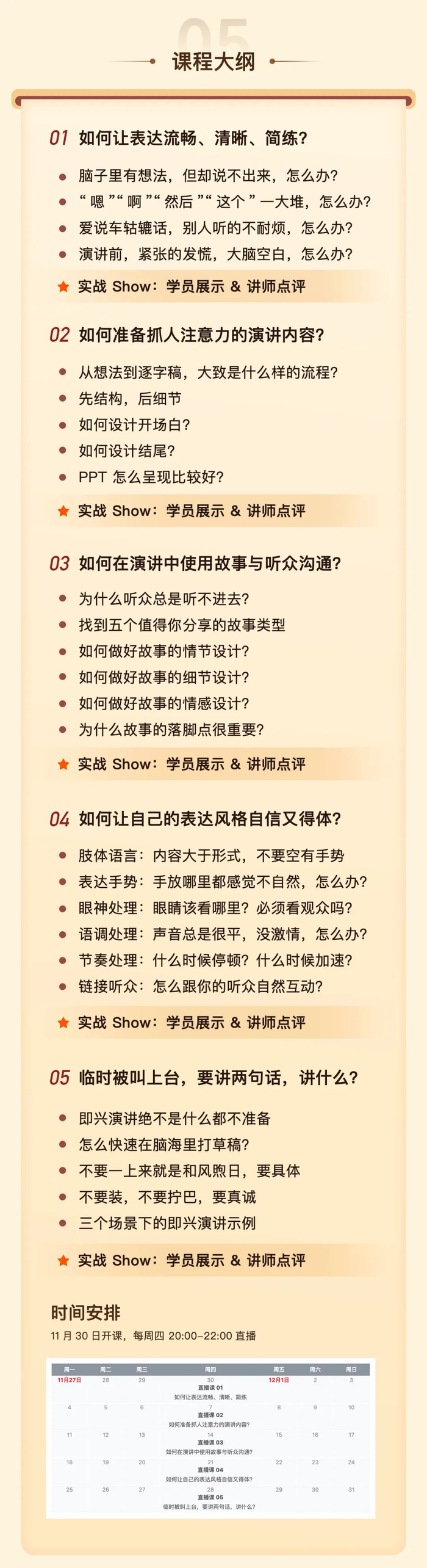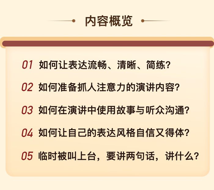 整个课程包含5 次直播课,分别去解决语言习惯、内容结构、吸引力、表达习惯、即兴讲话的问题。每一次直播的回放都可以永久观看。小盖作为助教,每节课后都会整理笔记,把我们认为关键的点用文字交付给你。当然啦,社群的交流、班主任的服务也必不可少。