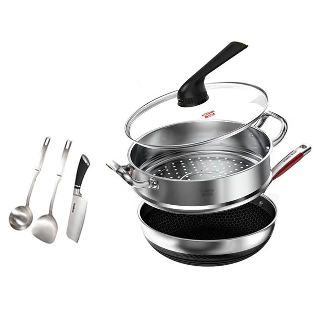 每口锅都附赠有:不锈钢锅铲×1、不锈钢汤勺×1、菜刀×1。
