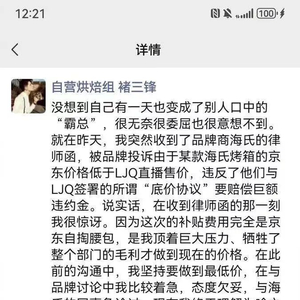 微信名显示为“自营烘焙组 褚三峰”的京东采销人员以朋友圈发文的形式披露,之所以收到品牌商海氏的律师函,正是因为京东该品牌某款烤箱低于淘宝直播间售价,导致品牌要为与达人签订的“底价协议”付出巨额违约金。