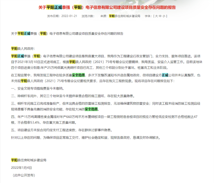 多个项目同时开工,拖垮了建设方的资金链,也导致了正威集团和承包方的资金矛盾。在双方争执之际,平阳住建局网站曾于2022年1月21日发布一份报告,随后又删除了该报告。报告直指正威平阳项目的建设存在质量安全隐患问题。打桩问题在一期的倒班宿舍楼项目上尤其明显,其预应力管桩低应变检测不合格桩数达47根,不合格率为53.4%,存在重大施工质量问题。