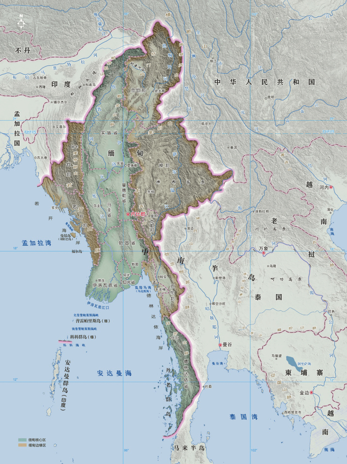 缅甸南北就分成了两个板块,南边靠近安达曼湾的那一块,行政划分都叫“省”,属于缅甸中央直辖区域。缅北就大片大片地行政划分都叫“自治区”,名义上加入了缅甸联邦,但实控权却完全掌握在地方军阀手里。