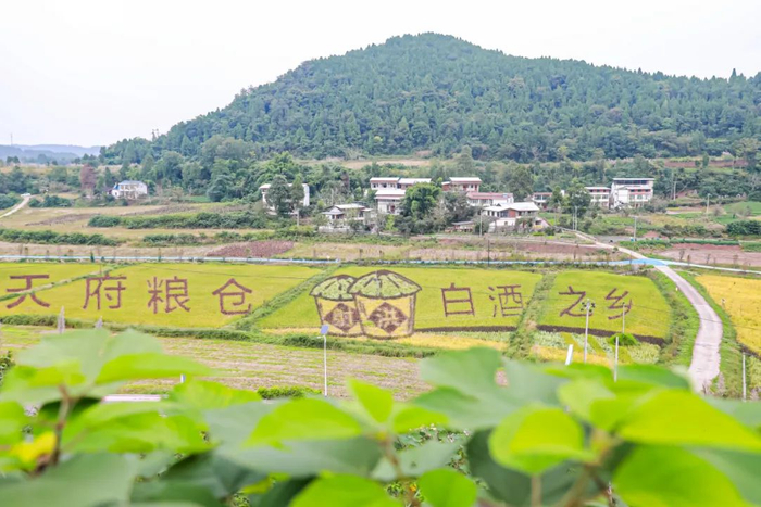在这里,根据不同时节,会用不同颜色的水稻高粱等按设计展现出图案,这一轮次种出的是“天府粮仓,白酒之乡”。