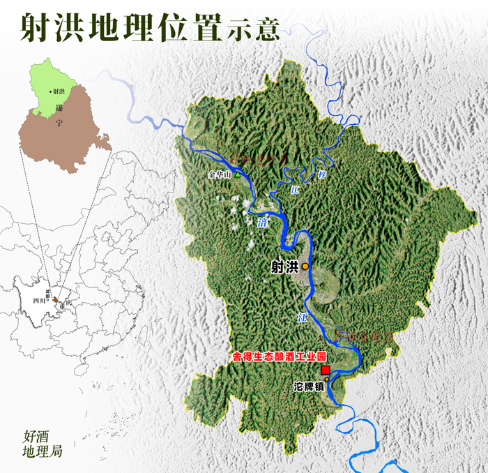 |涪江中游,四川盆地的底部,射洪小城安稳地坐落其中。这里是名传千年的“射洪春酒”的诞生地,如今也因沱牌舍得之名光芒依旧。 制图/好酒地理局视觉中心