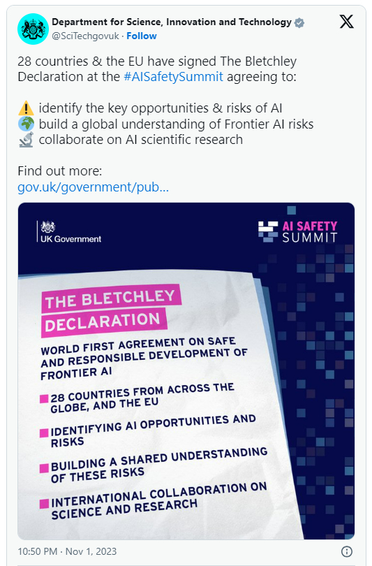 峰会期间,28个国家的领导人和代表签署了人工智能安全宣言。该声明名为《布莱切利宣言》,旨在解决所谓的前沿人工智能模型(由OpenAI等公司开发的大型语言模型)的风险。