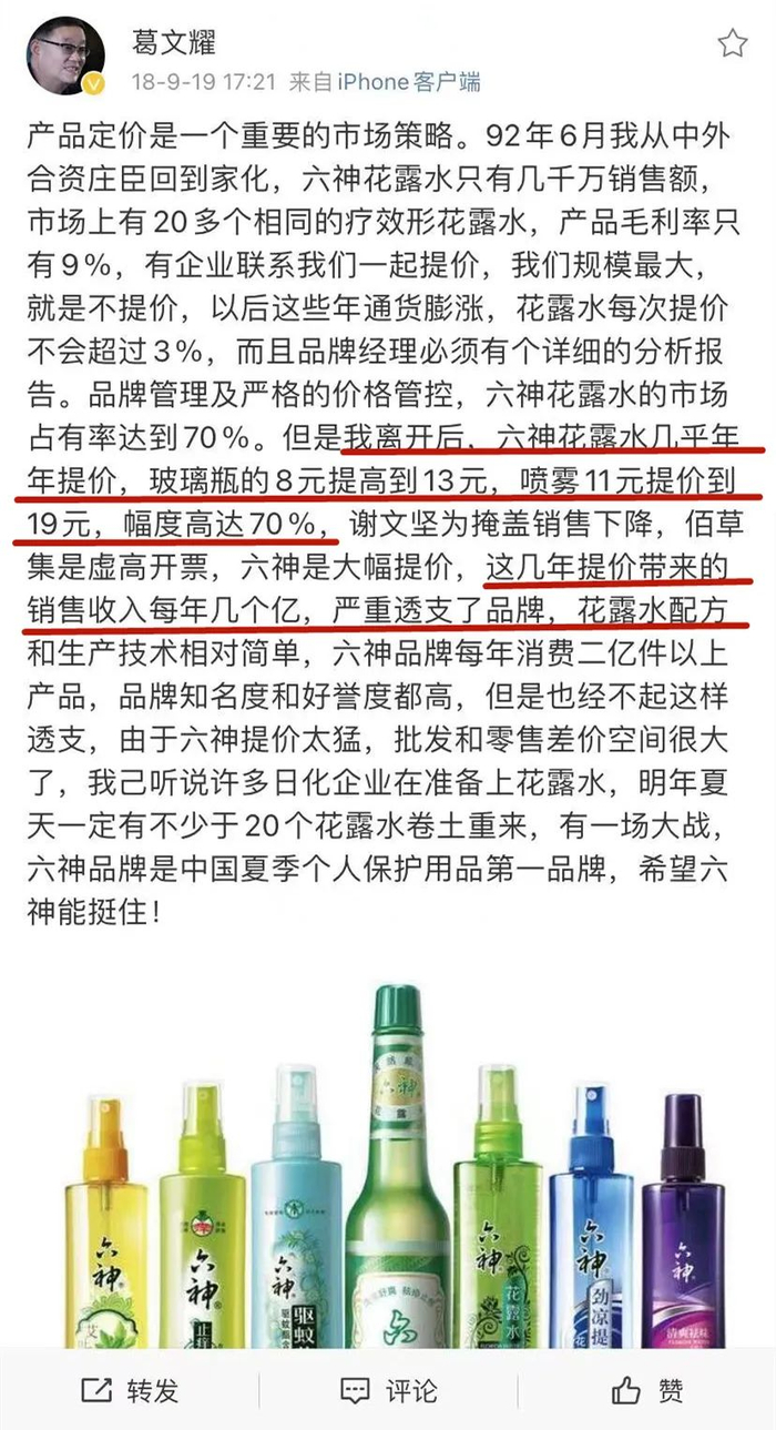 对于六神涨价,“六神花露水之父”——上海家化前董事长葛文耀曾公开发微博指出,“大幅提价严重透支了品牌,六神知名度和好誉度是高,但也经不起这样透支。”