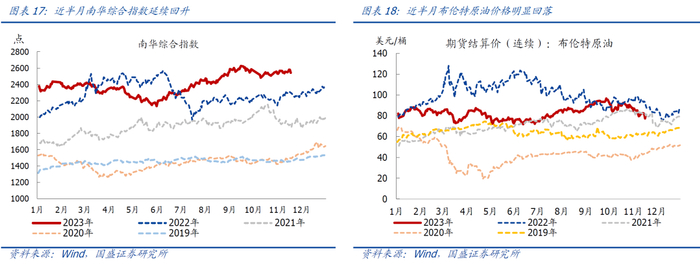 下游消费品:猪肉、蔬菜价格续跌。近半月来,猪肉价格均值环比续跌2.4%至20.4元/公斤,续创近年同期新低;相比2022年同期偏低约40.1%,跌幅继续扩大。蔬菜价格均值环比续降2.4%,相比2022年同期偏高约5.0%;节奏上看,11月中旬以来,蔬菜价格有所反弹。