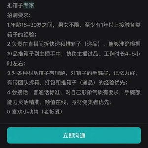“推箱子专家”是什么?其实就是电商直播中的主播助理。招聘软件的职位详情显示,推箱子专家要接触过各类箱子、负责在直播间拆快递和推箱子(或递品)、对各种材质的箱子有理解、对箱子手感好、记忆力好、会接话、手腕部能力灵活精准等。