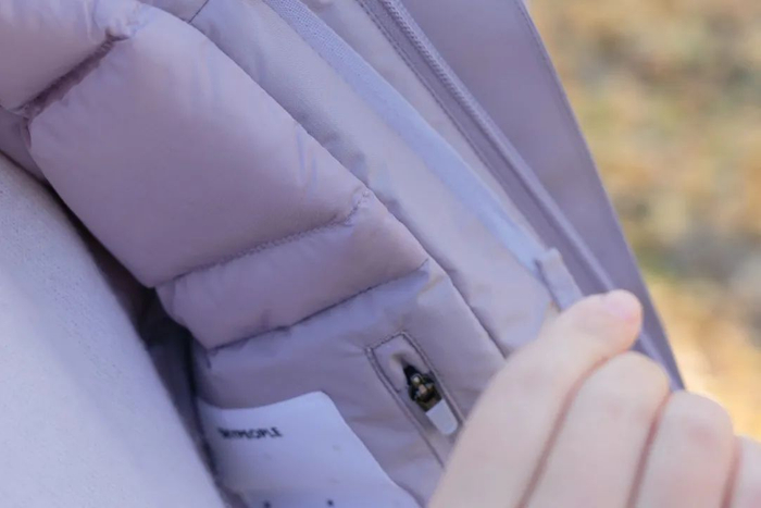 在保证极简的前提下,这款还做了不少隐藏式设计。比如帽子的抽绳、拉链内兜都暗藏在里面,可以收纳很多重要的小物件,不怕丢失。