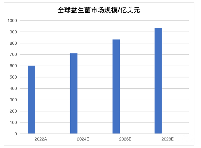 产业的重要性叠加高技术难度等,也推高了益生菌市场的未来成长空间。据BlueWeave机构的数据显示,2022年全球益生菌市场规模达到602.3亿美元,预计从2022年到2030年,全球益生菌市场将以8.7%的年复合增长率增长,到2028年有望达到934.9亿美元。