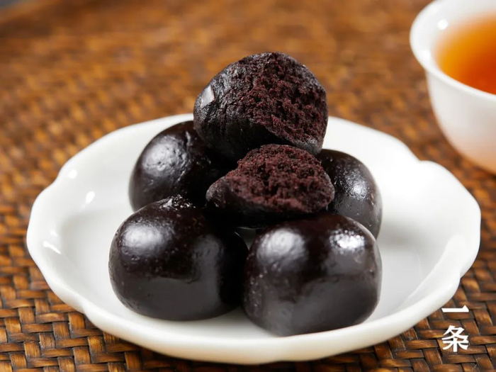 桑葚芝麻大丸糖呈黑褐色,口感湿润微弹、饱满。