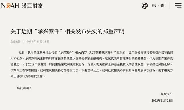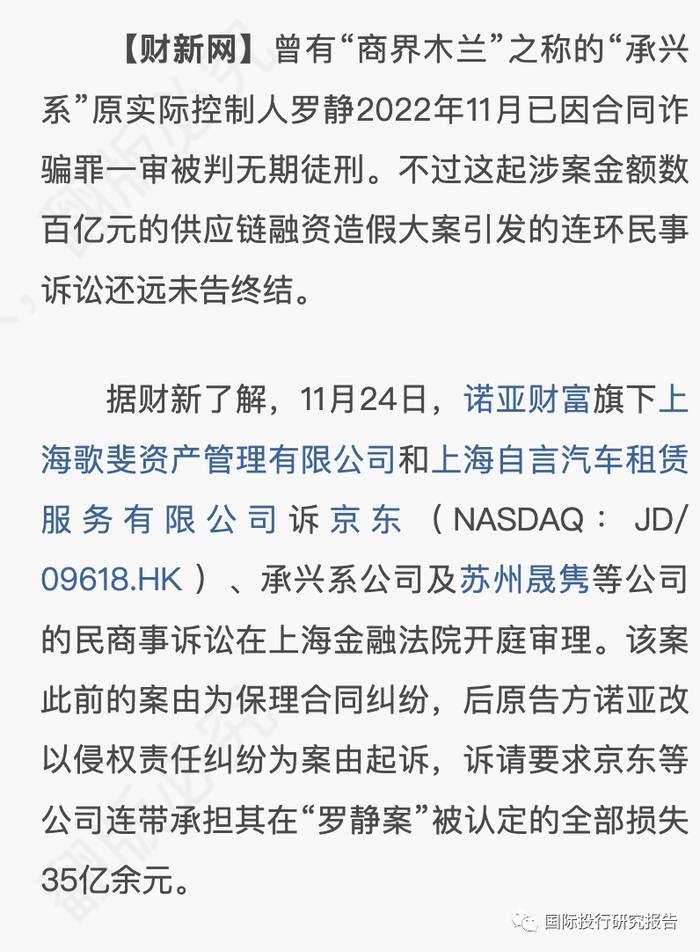 据了解,11月24日,上海市金融法院已再次开庭审理诺亚财富旗下歌斐资产和自言汽车诉京东及承兴控股、中诚实业、苏州晟隽等公司偿还其在“承兴系”刑事案件中被认定的全部损失35亿余元。