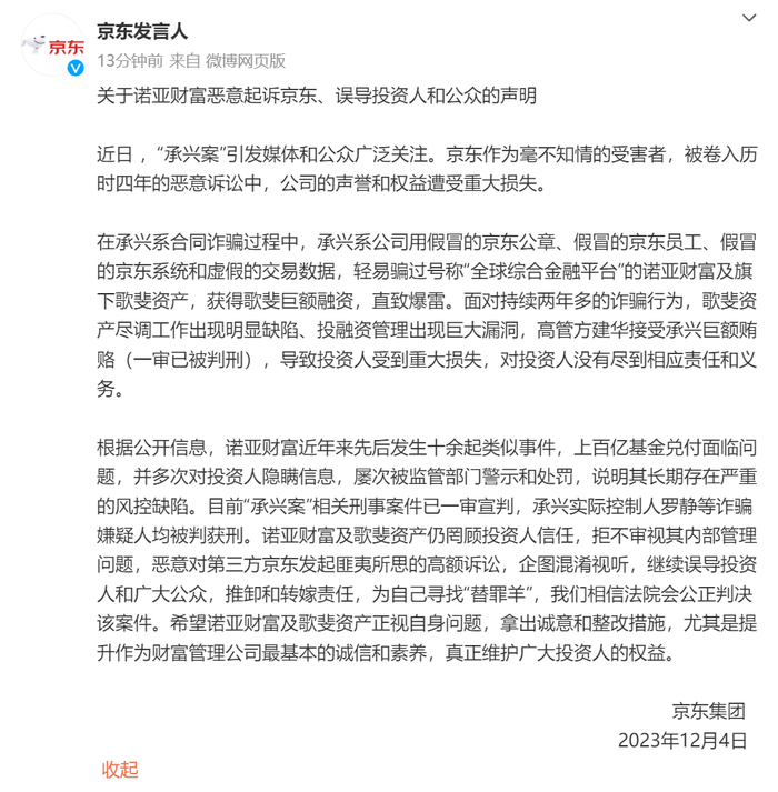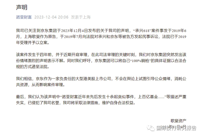 京东声明的用语已经超过了一般公关用语,而是旗帜鲜明地指称诺亚财富和歌斐资产问题大,京东表示,“承兴案”引发媒体和公众广泛关注。在承兴系合同诈骗过程中,承兴系公司用假冒的京东公章、假冒的京东员工、假冒的京东系统和虚假的交易数据,轻易骗过号称“全球综合金融平台”的诺亚财富及旗下歌斐资产,获得歌斐巨额融资,直致爆雷。但京东作为毫不知情的受害者,被卷入历时四年的恶意诉讼中,公司的声誉和权益遭受重大损失。