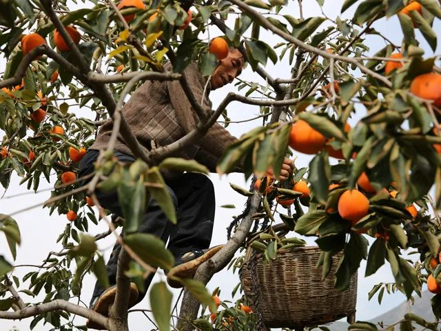 因为柿子十分娇嫩,不能用长杆子打,因此必须要爬上树一个个小心翼翼地摘取。