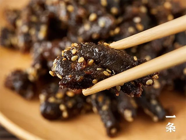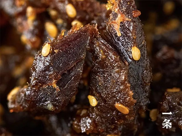 仔细观察,我们能看到条状的牛肉干上遍布了些许芝麻粒,还泛着一层湿润的油光,一点儿也不干巴,好似一道新鲜出炉的牛肉佳肴。