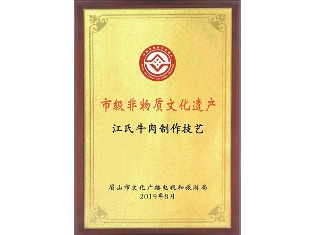 现今,江氏牛肉制作技艺已经获得了眉山市文化广播和旅游局颁发的“市级非物质文化遗产”证书,可见其技艺独特、精湛。