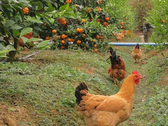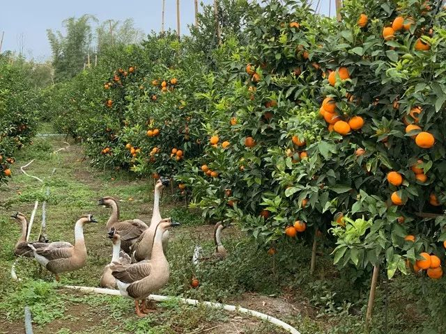 因为不打农药化肥,成群的鸡鸭鹅,就散养在沃柑果园里,闻着桔花香,吃着草丛里的小虫,自由漫步。