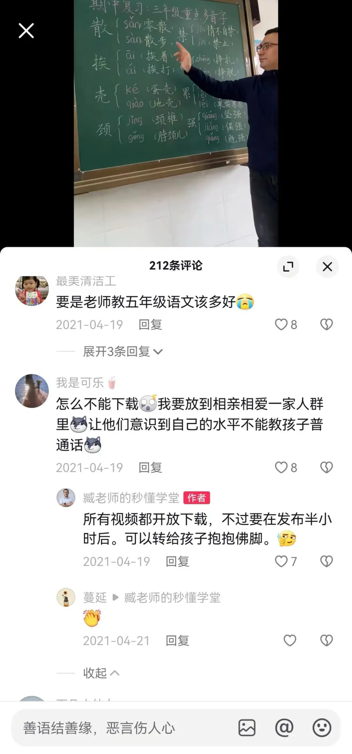 另一股支撑他的强劲动力则来自家长群体。他们从孩子一年级开始就跟着他的短视频学习。家长们在他的评论区交流心得,“每天跟臧老师学语文,不用担心孩子学习了”“不能错过老师的每一节课。”跟着他的视频复习,一位80后妈妈说自己的孩子在期中考试获得满分。
