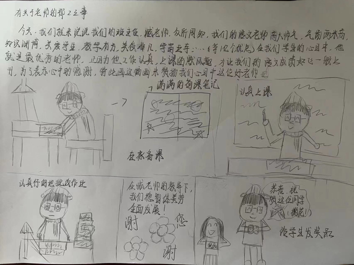 这是他多年来的朴素认知,也是一个教书匠的新鲜感来源。“现在媒体发达,课外读物也特别多,孩子们获取知识的渠道很多,老师有的时候未必比他们懂得多”。他把和学生的相处形容为“平等中的熟悉”。他的课间,孩子们经常走上讲台,拉着他的手聊天,分享新近知道的新鲜事儿。他们给他起了个色彩明艳的外号,叫“ Tomato”,还以他为主角创作连环画。