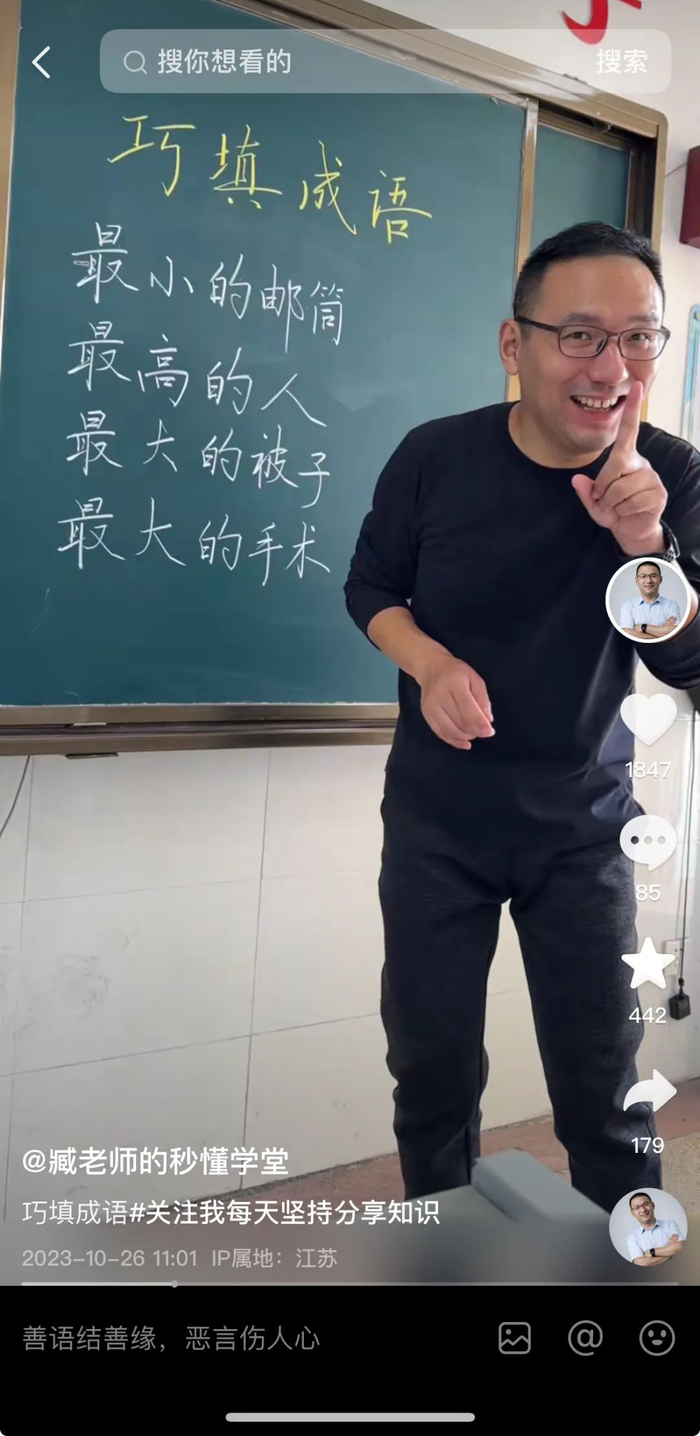 臧老师的学生甚至包括不少中老年人。一位41岁的网友把他的全部视频看了一遍,说他是“亲和力很好的老师”。一位61岁的抖音用户在他的评论区里留言,“老师讲课我听课,活到老学到老”。