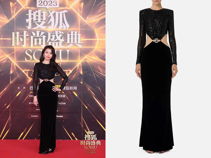 压轴走红毯的刘涛,一身黑色Look低调典雅。她的礼服来自意大利小众品牌Elisabetta Franchi 2023秋冬系列,腹部镂空挖剪,大秀腰线和马甲线,中间还有细节装饰,一半blingbling一半垂坠感的面料很显层次。