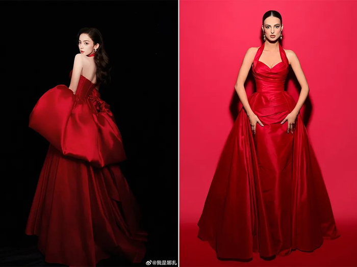 娜扎出场便让人眼前一亮,小众品牌Tarik Ediz的挂脖红裙很镇场子,连眼妆和唇妆都和谐统一。她在现场说自己平时很少穿艳丽的颜色,但这件衬得她肤色白到发光,加上复古风长卷发,有种古典美人风情。