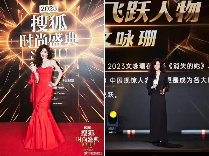 当晚同穿红裙子还有文咏珊,这让范主想起了她在《消失的她》里的造型之一。Alexander McQueen 2024早春的不对称垂褶礼服,扭结与鱼尾裙摆层次分明,恰到好处的褶皱也有着复古线条。上台领取年度飞跃人物奖时,她还换上了一条黑色的礼服裙,两套造型你更pick哪一套?