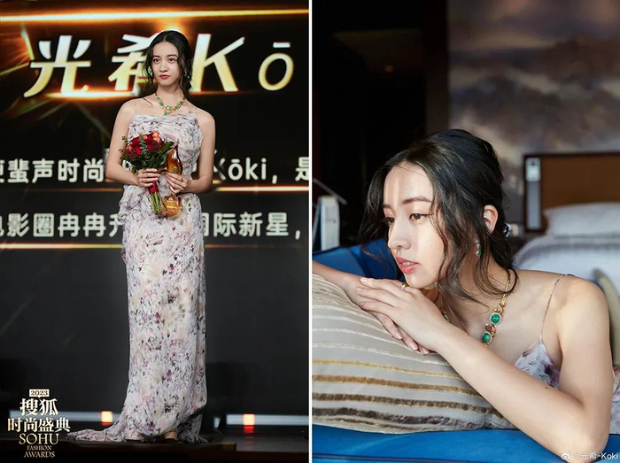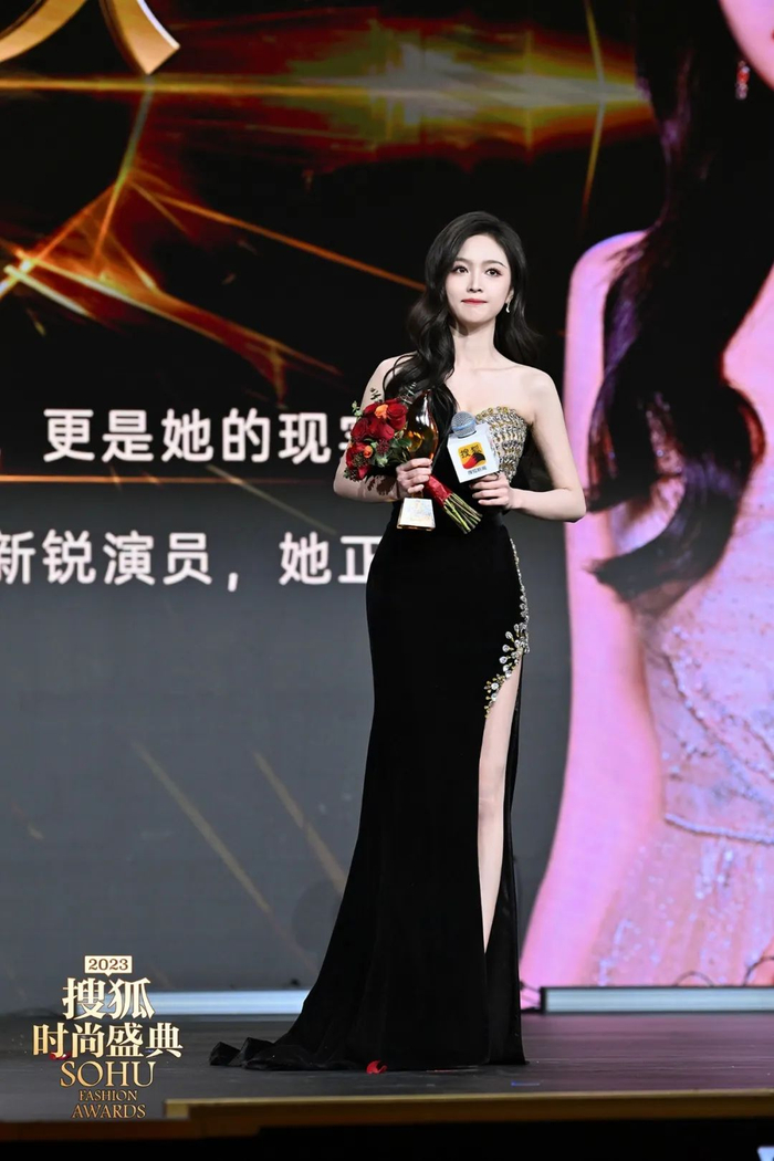 领奖时,她又换上了国内设计师品牌SELENE CHOW的黑色礼服,今年这种一半水钻一半缎面的礼服蛮流行,显瘦效果一流。