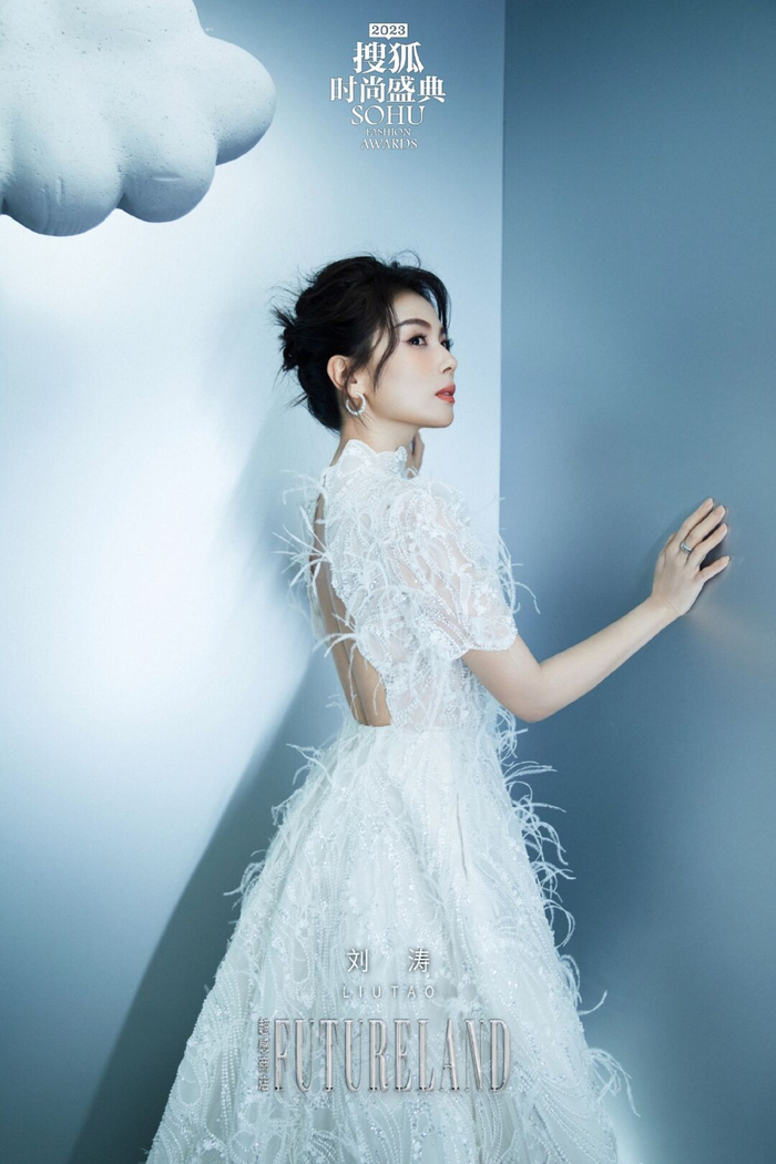 刘涛还有一套白色Look,珍珠白蕾丝裙上装饰着驼鸟毛和亮片,背后有挖剪设计,她深谙红毯“适度露肤法则”。