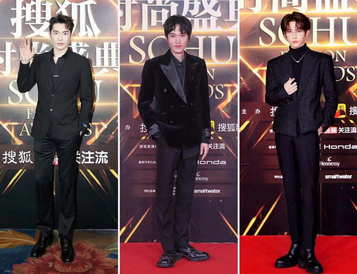 相比之下,王耀庆的条纹三件套西装就考究得多,复古深灰色条纹辨识度很高,和他本人的气质很搭。