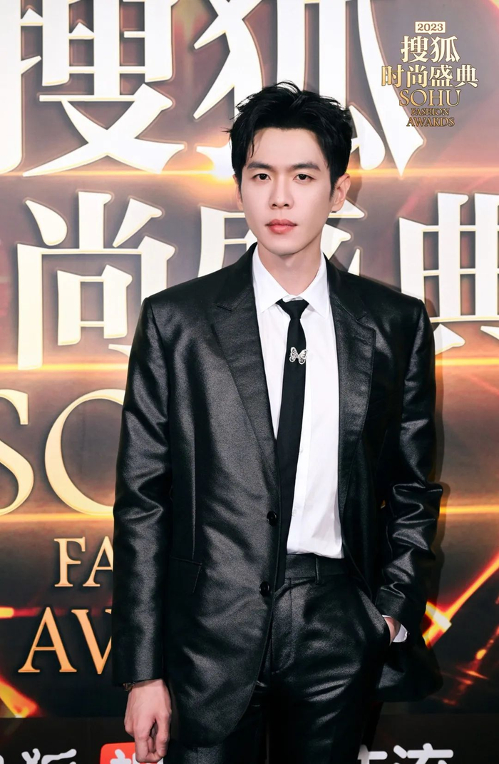 张若昀今年领取了年度品质人物大奖,他的亮面西装造型很有金属质感,领带上一枚蝴蝶胸针刚中带柔,走红毯效果很好。