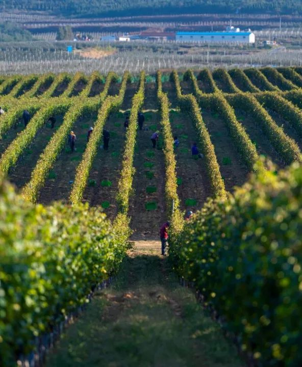 |长城葡萄酒山东蓬莱产区龙脊园内的采收场景