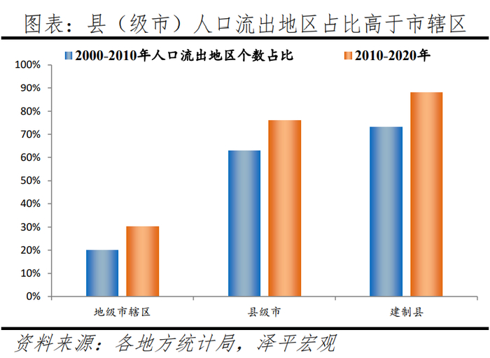 2)人口流出地区方面,分地区看,东北地区人口流出地区个数占比从66%增至90%,东部地区从58%增至69%,中部地区从67%增至84%,西部地区从65%增至77%。从行政建制看,地级及以上城市人口流出地区个数占比从20%增至30%,县级市从63%增至76%,建制县从73%增至88%,上升幅度最为显著。分线看,一、二线城市均无人口流出地区,三线城市从18%降至15%,四线城市从45%增至57%,五线城市从71%增至83%,六线城市从69%增至86%。