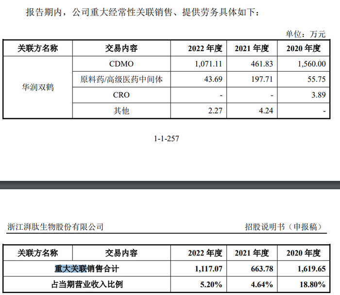 在一众大客户中,华润双鹤的身份较为特殊。作为持股25.29%的第一大股东,华润双鹤是湃肽生物的关联方。招股书显示,2020年至2022年,湃肽生物向华润双鹤重大关联销售金额分别为1619.65万元、663.78万元和1117.07万元,占当期营业收入的比例分别为18.80%、4.64%、5.20%。