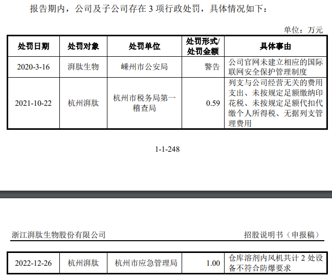公开资料显示,湃肽生物此前也多次被处罚。其中,2021年10月22日,湃肽生物旗下杭州湃肽生化科技有限公司被杭州市税务局予以行政处罚5896.35元。2022年12月26日,杭州湃肽生化科技有限公司又被杭州市应急管理局予以行政处罚10000万。