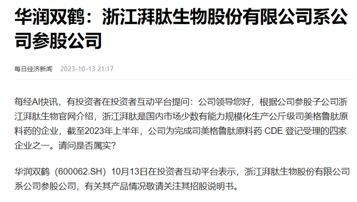 因为湃肽生物的IPO,作为股东的华润双鹤曾多次被投资者问及相关问题,也收到了不少关注度。10月中旬,投资者还在问及相关问题。